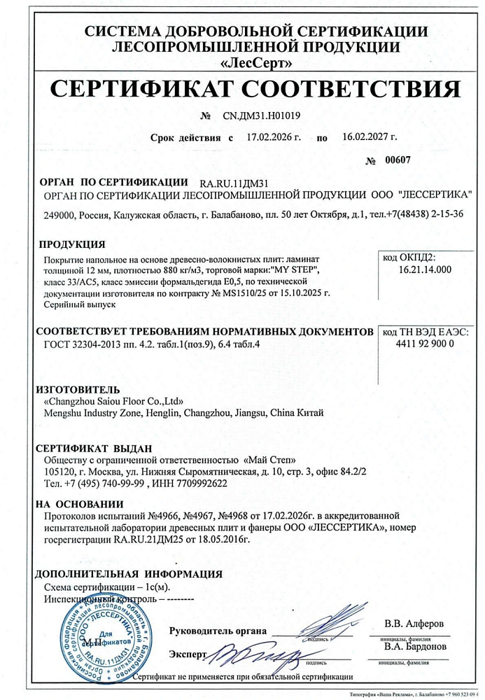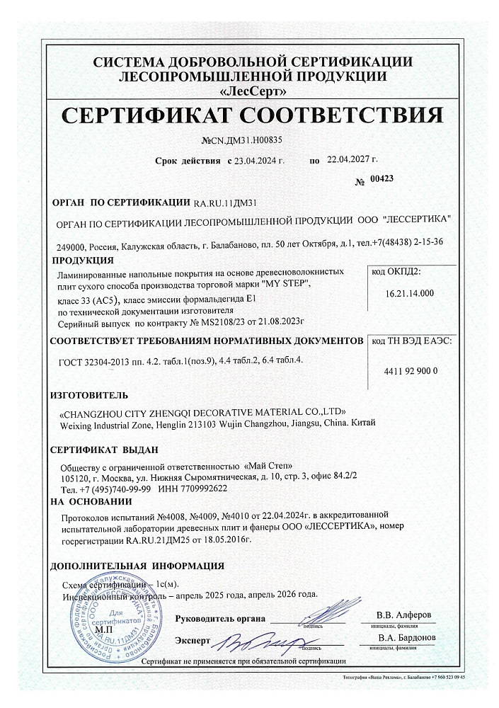 Заключение эксперта № 3733 — Подтверждено соответствие класса эмиссии формальдегида E1 для ламината My Step. Лессертика, сентябрь 2023 г.